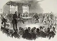 He began his theatre career by diverting the audience with a few tricks between plays, but by 1834 he was providing the whole programme at Wolverhampton's Assembly Rooms.[28] These were on the first floor of the County Court building, built 1829 in Queen Street. The performance was in three parts. In Part I he demonstrated the Chest of Archimedes and the Column of Rosbach. These were entertaining pieces of mechanical apparatus previously shown at the cabinet of curiosities in Paris. This was followed by numerous illusions, including A Game at Whist, Time Flies, The Wax Candles Enchanted, Elephant of Knowledge, Vulcan's Forge, Miraculous Printing, Flying Watch, Magic Bottle, Apples of Beelzebub, Magic Eggs and Loyal Metamorphose. Part II began with a ventriloquist act called Rogueries of Nicholas. He followed this by whistling various birdsong impressions.[30] This popular party piece was developed via a "variety of scenes and characters drawn from nature, introductory of His Surprising Powers of Imitation" in which he contorted his face, told stories and performed tricks of ventriloquism. In Part III he performed "feats of strength in the character of a Chinese buffo", suggesting that in Parts I and II he was most likely wearing the customary evening dress of the Victorian theatre magician, and that such a costume was less suitable for acrobatics than loose Chinese pyjamas. The strongman act was followed by "gymnastic exercises" or acrobatics involving bodily contortions with a balancing act. Last of all came the climax of the performance: the Aerial Suspension Illusion.[28] In certain theatres he used to ban sale of tickets to the gallery, because the view from there might betray the secret of the illusion.[27]