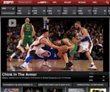 An editor used the phrase as a headline on the company's web site in February 2012; the headline was titled "Chink In The Armor", and referred specifically to Lin.[5] The headline was a reference to Lin's unsuccessful game against the New Orleans Hornets, suggesting that Jeremy Lin's popularity and winning streak were weakening.[6] While ESPN has used the phrase "chink in the armor" on its website over 3,000 times before, its usage in this instance was considered offensive because it directly referred to a person of Asian descent.[7] Many viewed the usage of the phrase as a double entendre.[5] ESPN quickly removed the headline, apologized, and said it was conducting an internal review.[8] The editor, Anthony Federico, denied any idiomatic usage, saying "This had nothing to do with me being cute or punny ... I'm so sorry that I offended people. I'm so sorry if I offended Jeremy."[5] Nevertheless, he was fired.[5]
