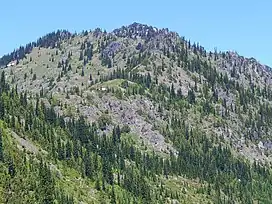 Chinook Peak is a 6,904 feet (2,104 m) summit located on the eastern border of Mount Rainier National Park. It is also on the shared border of Pierce County and Yakima County in Washington state. Chinook Peak is situated north of Chinook Pass on the crest of the Cascade Range. Its nearest higher peak is Crystal Mountain, 1.31 mi (2.11 km) to the north.[1] Crystal Peak lies 0.75 mi (1.21 km) to the northwest, and Cupalo Rock is 1.0 mi (1.6 km) to the east-northeast. Precipitation runoff from Chinook Peak drains into tributaries of the White River and Yakima River.
