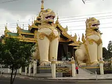 Chinthe[lower-alpha 1] (Burmese: ခြင်္သေ့ (IPA: [tɕʰɪ̀ɰ̃ðḛ]); Mon: ဇာဒိသိုၚ် ([cɛ̀atìʔsaŋ]); Shan: သၢင်ႇသီႈ ([sàːŋ si])) is the Burmese word for 'lion'.[2][3] The leograph[4][5] of Chinthe is a highly stylized lion[6][7] commonly depicted in Burmese iconography and architecture, especially as a pair of guardians flanking the entrances of Buddhist pagodas and kyaung (or Buddhist monasteries).