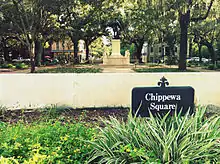 In the center of the square is the James Oglethorpe Monument, created by sculptor Daniel Chester French and architect Henry Bacon and unveiled in 1910.[1] Oglethorpe faces south, toward Georgia's one-time enemy in Spanish Florida, and his sword is drawn.[2] Busts of Confederate figures Francis Stebbins Bartow and Lafayette McLaws were moved from Chippewa Square to Forsyth Park to make room for the Oglethorpe monument.[3] Due to the location of the monument, Savannahians sometimes refer to this as Oglethorpe Square, but that is located just to the northeast.[4]