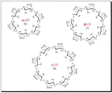 Initially natural CDs have been used as the chiral selector. Later, modified cyclodextrin structures have been prepared by derivatizing the secondary hydroxyl groups present on the CD molecule.[74][75] Incorporation of these additional functional groups may improve the chiral recognition capability by possibly modifying the chiral pocket and creating extra auxiliary interaction site. This approach enabled to expand the range of target chiral analytes that could be separated. A number of chiral pharmaceuticals has been resolved using derivatized CDs including ibuprofen, suprofen, flurbiprofen from NSAID category and b-blockers like metoprolol and atenolol.[76] A brief list of cyclodextrin-based chiral stationary stationary phases available in the market is furnished in the table below.[77]