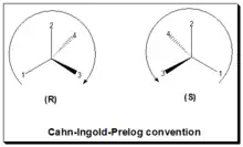 In the CIP or R/S convention, or sequence rule, the configuration, spatial arrangements of ligands/substituents around a chiral center, is labeled as either "R" or "S".[18][2] This convention is now almost worldwide in use and become a part of the IUPAC (International Union of Pure and Applied Chemistry) rules of nomenclature. In this approach: identify the chiral center, label the four atoms directly attached to the stereogenic center in question, assign priorities according to the sequence rule ( from 1 to 4), rotate the molecule until the lowest priority (number 4) substituent is away from the observer/viewer, draw a curve from number 1 to number 2 to number 3 substituent. If the curve is clockwise, the chiral center is of R-absolute configuration, "R" (Latin, rectus = right). If the curve is counterclockwise, the chiral center is of S-absolute configuration, "S" (Latin, sinister = left). Refer to figure, the Cahn-Ingold-Prelog rule.
