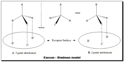Easson and Stedman[30] (1933) advanced a drug-receptor interaction model to account for the differential pharmacodynamic activity between enantiomeric pairs. In this model the more active enantiomer (the eutomer) take part in a minimum of three simultaneous intermolecular interactions with the receptor surface (good fit), Figure. A., where as the less active enantiomer (distomer) interacts at two sites only (bad fit), Figure B. [Refer image for Figure: Easson-Stedman model]. Thus the "fit" of the individual enantiomers to the receptor site differs, as does the energy of interaction. This is a simplistic model but used to explain the biological discrimination between enantiomeric pairs.