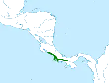 It is found southwestern Costa Rica to western Panama. Its natural habitats are subtropical or tropical moist lowland forest and subtropical or tropical swampland.