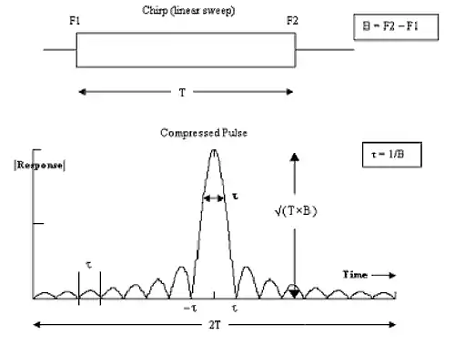 Briefly, the basic pulse compression properties can be related as follows. For a chirp waveform that sweeps over a frequency range F1 to F2 in a time period T, the nominal bandwidth of the pulse is B, where B = F2 – F1, and the pulse has a time-bandwidth product of T×B. Following pulse compression, a narrow pulse of duration τ is obtained, where τ ≈ 1/B, together with a peak voltage amplification of √T×B.