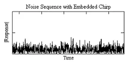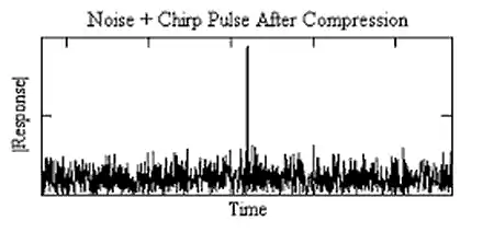 In order to compress a chirp pulse of duration T seconds, which sweeps linearly in frequency from F1 Hz to F2 Hz, a device with the characteristics of a dispersive delay line is required. This provides most delay for the frequency F1, the first to be generated, but with a delay which reduces linearly with frequency, to be T second less at the end frequency F2. Such a delay characteristic ensures that all frequency components of the chirp pass through the device, to arrive at the detector at the same time instant and so augment one another, to produce a narrow high amplitude pulse, as shown in the figure: