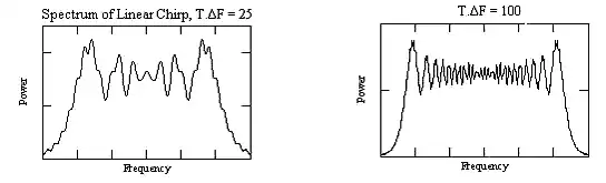 The Fresnel ripples on a chirp spectrum are very obtrusive, especially when time-bandwidth products are low (under 50, say) and their presence leads to high time sidelobe levels when chirps are subject to pulse compression as in radar and sonar systems. They arise because of the sudden discontinuities in the chirp waveform at the commencement and termination of the pulse.