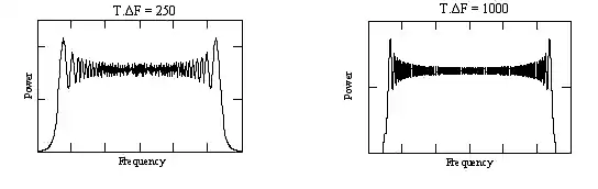 Some plots of the power spectrum |S(ω)|2 as a function of frequency are shown, for time-bandwidth products of 25, 100, 250 and 1000. When the product is small, the Fresnel ripples are very much in evidence, but the spectrum does tend to a more rectangular profile for larger values.
