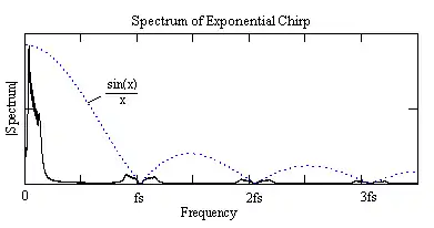 In the case of a non-linear chirp, or a linear chirp shaped by amplitude weighting, the fraction of power outside ΔF is even lower, as is shown on the graph, where the dashed line is for spectra with Hamming profiles.