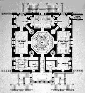 Chiswick House was an attempt by Lord Burlington to create a Roman villa, rather than a Renaissance pastiche, situated in a symbolic Roman garden.[45] Chiswick Villa is inspired in part by several buildings of the 16th-century Italian architects Andrea Palladio and his assistant Vincenzo Scamozzi. The house is often said to be directly inspired by Palladio's Villa Capra "La Rotonda" near Vicenza,[46] as architect Colen Campbell had offered Lord Burlington a design for a villa closely based on the Villa Capra for his use at Chiswick. However, although this was clearly influential, Lord Burlington rejected this design; it was subsequently used at Mereworth Castle, Kent.[47] Lord Burlington's library list at Chiswick shows that he was not restricted to the influence of Andrea Palladio. He owned books by influential Italian Renaissance architects such as Sebastiano Serlio and Leon Battista Alberti, and his library contained books by French architects, sculptors, illustrators and architectural theorists like Jean Cotelle, Philibert de l'Orme, Abraham Bosse, Jean Bullant, Salomon de Caus, Roland Fréart de Chambray, Hugues Sambin, Antoine Desgodetz, and John James's translation of Claude Perrault's Treatise of the Five Orders. Whether Palladio's work inspired Chiswick or not, the Renaissance architect exerted an important influence on Lord Burlington through his plans and reconstructions of lost Roman buildings; many of these, unpublished and little known, were purchased by Burlington on his second Grand Tour and housed in the Blue Velvet Room, which served as his study.[48] These reconstructions were the source for many of the varied geometric shapes within Burlington's Villa, including the use of the octagon, circle and rectangle (with apses).[49][50][51] Possibly the most influential building reconstructed by Palladio and used at Chiswick was the monumental Roman Baths of Diocletian:[51][52] references to this building can be found in the Domed Hall, Gallery, Library and Link rooms.