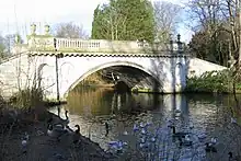 The Classic Bridge located beyond the Orange Tree Garden was built for Georgiana Spencer. It was constructed in 1774 to the designs of James Wyatt. Alterations were made to the gardens in 1778 by the fifth Duke of Devonshire and included the demolition of the Casina in 1778 and the pulling down of the Gibbs Pagan Temple by 1784.[77] Richard Hewlings states that the reason for such actions was not neglect but rather: "it was a change of taste, away from artificial temples located within a geometrically ordered plan".[77] In 1784 the Duke engaged Samuel Lapidge, a landscape designer who had previously worked under Lancelot 'Capability' Brown, to make further changes to the garden, including the filling in of the northern rectangular pond. The Sixth Duke of Devonshire (the 'Bachelor' Duke) obtained permission in 1813 to relocate Burlington Road beyond the two piers at the front of the forecourt to its present position.