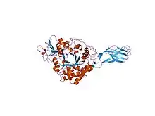 In molecular biology, the chitinase A N-terminal domain is found at the N-terminus of a number of bacterial chitinases and similar viral proteins. It is organised into a fibronectin III module domain-like fold, comprising only beta strands. Its function is not known, but it may be involved in interaction with the enzyme substrate, chitin.[1][2] It is separated by a hinge region from the catalytic domain; this hinge region is probably mobile, allowing the N-terminal domain to have different relative positions in solution.[1]