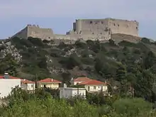 It was built in the early 1220s by the Crusader rulers of the Principality of Achaea as their main stronghold and is perhaps the finest fortification of the early period of Frankish rule in Greece preserved in the country today.[1] The castle is located on a small plateau 226 metres (741 ft) above sea level and comprises a central hexagonal keep built around an inner courtyard and containing two-storeyed halls along its entire length, and complemented by an outer wall enclosing an outer yard on its western side. The castle is largely preserved in its original 13th-century state, with only minor later modifications for the installation of artillery.
