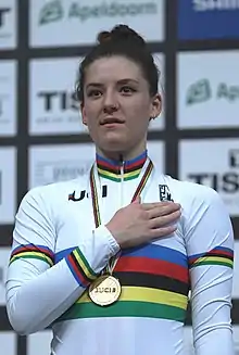 Chloé Dygert (born January 1, 1997) is an American professional racing cyclist,[3] who currently rides for UCI Women's WorldTeam Canyon–SRAM.[4] She has won seven gold medals at the UCI Track Cycling World Championships and a silver medal at the Olympic Games. She also won the Women's junior road race and Women's junior time trial at the 2015 UCI Road World Championships.