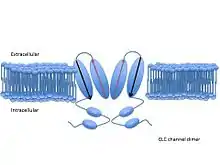 Voltage-gated chloride channels are important for setting cell resting membrane potential and maintaining proper cell volume. These channels conduct Cl or other anions such as HCO3, I, SCN, and NO3. The structure of these channels are not like other known channels. The chloride channel subunits contain between 1 and 12 transmembrane segments. Some chloride channels are activated only by voltage (i.e., voltage-gated), while others are activated by Ca2+, other extracellular ligands, or pH.[2]