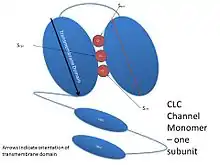 A cartoon representation of a CLC chloride channel. The arrows indicate the orientation of each half of the individual subunit. Each CLC channel is formed from two monomers, each monomer containing the antiparallel transmembrane domain. Each monomer has its own pore through which chloride and other anions may be conducted.