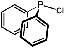 Chlorodiphenylphosphine is an organophosphorus compound with the formula (C6H5)2PCl, abbreviated Ph2PCl. It is a colourless oily liquid with a pungent odor that is often described as being garlic-like and detectable even in the ppb range. It is useful reagent for introducing the Ph2P group into molecules, which includes many ligands.[2] Like other halophosphines, Ph2PCl is reactive with many nucleophiles such as water and easily oxidized even by air.