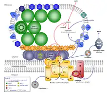 Chlorosome shape can vary between species, with some species containing ellipsoidal shaped chlorosomes and others containing conical or irregular shaped chlorosomes.[4] Inside green sulfur bacteria, the chlorosomes are attached to type-I reaction centers in the cell membrane via FMO-proteins and a chlorosome baseplate composed of CsmA proteins.[5] Filamentous anoxygenic phototrophs of the phylum Chloroflexota lack the FMO complex, but instead use a protein complex called B808-866. Unlike the FMO proteins in green sulfur bacteria, B808-866 proteins are embedded in the cytoplasmic membrane and surround type-II reaction centers, providing the link between the reaction centers and the baseplate.[6]