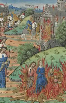 The news of Childebert's death had caused many kingdoms to unify under Chlothar. Paris, which had fought against him, submitted to his rule. Chram therefore called on the Bretons to allow him refuge. He had made such an agreement with his father-in-law Willacharius, Count of Orléans, although he was currently taking refuge himself in the Basilica of St. Martin of Tours. He was caught and subsequently burned "for the sins of the people and the scandals that were perpetrated by Wiliachaire and his wife." Chlothar then restored the Basilica.[29]