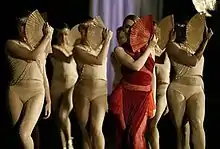 The video begins with a shot of Minogue posing in a dark room, dressed in a sparkling costume on which rainbow-lighting is projected. She is then shown in front of a wall wearing a flowing maroon dress. As the intro ends and the first verse commences, Minogue appears in a hall and performs various dance routine with numerous female dancers clad in nude bodysuits. The singer's attire consists of a pleated red organza dress designed by Austrian fashion designer Helmut Lang (in 2006, Minogue donated this costume to the Arts Centre Melbourne museum, where it is displayed in the Kylie Minogue Collection).[19] Shots of the dancers in kaleidoscopic arrangements are intercut. A few seconds later, Minogue and a man dance together alone in a hall. Their dance ends with the man slowly laying Minogue down on the floor and leaving. Twelve women in golden and pastel pink dresses are seen dancing on a dark brown floor, which is revealed to be Minogue's hat as the camera pans out. She proceeds to wave to a distant person and then plucks the petals out of a pink rose she is holding. The rest of the video randomly intersperses all of the previous scenes.[22] Complimenting the video's cinematography, arts and music writer Lesley Chow described it as "a deliriously romantic vision of surrender", adding: "Shadforth's depiction of warm bodies in a sensual world must be one of the most compelling realisations of the female gaze on film."[13]