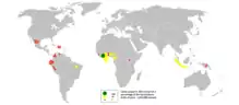 In the 2018–2019 growing year (which runs October through September),[60] 4.78 hundred thousand tonnes of cocoa beans were produced. African nations produced 2.45 million tonnes (69%), Asia and Oceania 0.61 million tonnes (17%) and the Americas 0.48 million tonnes (14%).[3] Two African nations, Côte d'Ivoire and Ghana, produce more than half of the world's cocoa, with 1.23 and 0.73 million tonnes respectively (35% and 21%, respectively).[3]