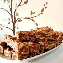 Chocolate salami is an Italian and Portuguese dessert made from cocoa, broken biscuits, butter, eggs and sometimes alcohol such as port wine or rum. The dessert became popular across Europe and elsewhere, often losing alcohol as an ingredient along the way.[1]