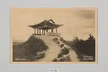 The Choesung Pavilion is an historic structure located on Moran Hill in Kyongsang-dong, Chung-guyok, Pyongyang, North Korea. First built in the 6th century, it was rebuilt in 1716.[1] One of the National Treasures of North Korea, it is located at the highest point of the hill, 95 meters above ground.[2] The pavilion is bounded on the south and west by rounded, low summits separated by three valleys. It offers views of the many species of trees growing on the hill, including pine, fir, Korean pine, trifoliate pine, linden and poplar. One can seasonally also observe over 70 species of birds from the location.[3]