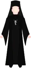 In Eastern Orthodoxy and Byzantine Catholicism, monks wear a black cloak, the mandyas over the outer cassock. The mandyas completely covers the monastic below the chin and reaches to the floor. In the Greek usage, the mandyas is usually worn only when performing certain liturgical roles; in the Slavic usage, all monks and nuns of the rank of Stavrophore or above wear the mandyas at every service, so long as they are in their own monastery. The mandyas of an hegumen (abbot) is of black silk, that of an archimandrite or bishop is of colored silk (specific usages will differ by jurisdiction), and has four square "tablets" on it: two at the neck and two at the feet. A bishop's mandyas additionally has "rivers" on it: three horizontal stripes either of gold (Greek practice) or red and white (Slavic practice).