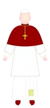 Bishops wear the above-mentioned purple cassock with scarlet piping, and add a pectoral cross suspended from a green and gold cord, a mozzetta over the rochet, and a purple zucchetto under the biretta. A cardinal wears a scarlet cassock with scarlet trim, pectoral cross on a red and gold cord, and a red mozzetta over the rochet, with a red zucchetto. The Pope's choir dress includes a white cassock, rochet, red silk mozetta, and red brocade stole; his pectoral cross hangs from a golden cord. Some canons wear their cross on a ribbon, but only a bishop may wear the cross on a cord. Under new regulations, neither bishops nor canons wear fur-trimmed cappas.