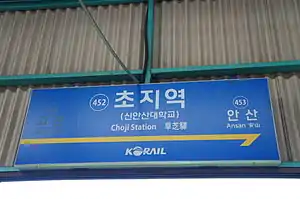 Choji Station is a commuter railway station on Seoul Subway Line 4 and Seohae Line in Ansan, South Korea. Trains on Line 4 utilize what is officially named the Ansan Line within the city of Ansan, as do those on the Suin-Bundang Line, which stop at the station on the same tracks using the same platforms.[1]