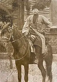 A chokha[lower-alpha 1] also known as a cherkeska[2] is a woolen coat with a high neck that is part of the traditional male dress of peoples of the Caucasus.[3] It was in wide use among Avars, Abazins, Abkhazians, Eastern Armenians,[4] Azerbaijanis, Balkars, Chechens, Circassians, Georgians, Ingush, Karachays, Nogais, Ossetians, Tats, the peoples of Dagestan, as well as Terek and Kuban Cossacks who adopted it from the aforementioned peoples.