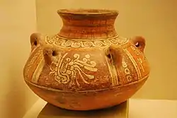 During the Early Postclassic there might have been an ethnic change, suggested by the influx of Gulf Coast motifs and by the burial at the pyramid of an individual with Maya-style cranial modification and inlaid teeth.[2]
