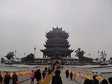 In the mid-20th century, Chongyuan Temple was destroyed during the Cultural Revolution.[4] In 2003, the Jiangsu provincial government approved the reconstruction of Chongyuan Temple and the rebuilt temple opened on November 17, 2007. At the time of its opening the temple's main hall was both the largest (2,400 m2 (26,000 sq ft)) and highest (38 m (125 ft)) main temple hall in China.[5] A 33-metre (108 ft) gilded bronze statue of Guanyin stands within the hall structure.