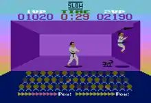 Chop Suey is a one-on-one martial arts fighting game. The action takes place on a box-type stage, watched by an audience sitting in several rows of seats in front of two competitors. Each successful attack on an opponent means their pain bar goes up and when the bar is full, the POW symbol will start blinking. It means the player is in a very fragile state of health - one more punch or kick and the fighter will fall. The match ends when the fighter falls eight times or the timer runs out. At the top of each wall air vents will open occasionally, allowing scorpions to drop to the floor and scuttle away. The players should avoid them at all costs, as they give potentially lethal bites.