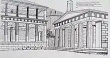 The Choragic Monument of Nikias is a memorial building built in the Acropolis of Athens in 320–319 BCE to commemorate the choregos Nikias, son of Nikodemos.[1] It was situated between the Theatre of Dionysos and the Stoa of Eumenes where its foundations remain along with some fragmentary elements of the structure. It was built in the form of a substantial hexastyle Doric temple with a square cella and might have been surmounted with the prize tripod of the Dionysia.[2] The monument was dismantled at some point in late antiquity and the masonry reused in the Beulé Gate.