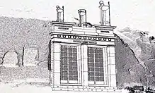Sometime in the Christian period a church was installed in the cave dedicated to Panaghia Spiliotissa. Lord Elgin removed the Hellenistic statue of Dionysos[8] in 1802 as a part of the Elgin Marbles thus the sculpture was spared when the monument was destroyed by an Ottoman bombardment during the siege of Athens in 1827. Although the monument was scheduled to be restored in the nineteenth century by the Athens Archaeological Society some of the marble was recarved and reused on the Byzantine church of Soteira Lykodimou. Recent restoration work began in 2002 and draws largely on the measured drawing by Stuart and Revett undertaken in the eighteenth century.[9] It was through the work of Stuart and Revett and J. D. Le Roy's Ruines des plus beaux monuments de la Grece (1758) that the Thrasyllos monument would influence later architecture. Both Karl Friedrich Schinkel and Alexander Thomson adopted the post-and-lintel, trabeated construction of the monument in their work.[10]