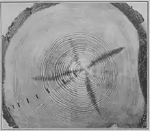 Instead of affecting the whole area subject to budworm infestation, some past outbreaks have occurred in separate regions.[52] For example, in the lower St. Lawrence and Gaspé regions, radial-growth studies of balsam fir and white spruce confirmed outbreaks known to have taken place in lower St. Lawrence in 1878 and 1912. The Gaspé area was thought to have escaped those outbreaks, but Blais found that the 1912 outbreak had covered more than 2 million ha in that region. Within affected regions, epidemics did not recur regularly.[53] In 1965, Blais obtained further evidence from the radial growth on basal disks of balsam fir, white spruce, and black spruce (susceptible species), and non-susceptible white pine in the Laurentide Park, Quebec. He concluded that outbreaks occurred in 1704, 1748, 1808, 1834, 1910, and 1947.[54] The more recent outbreaks seemed to be more severe than earlier ones, possibly due to an increase of highly susceptible balsam fir and a decrease of less susceptible white spruce following harvesting operations.[25]