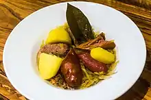 Choucroute garnie (French for dressed sauerkraut) is an Alsatian recipe for preparing sauerkraut with sausages and other salted meats and charcuterie, and often potatoes.