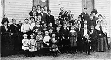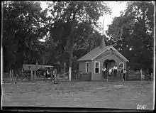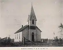 In 1870, St. Martin's Catholic Church, an 18x24 log structure, was built in Chouteau Springs on 1.5 acres of land donated by Daniel Martin, called "Martinsville."[8] A larger frame structure church was built on the same grounds in 1877 and in 1908 a solid red brick church was built on 2.25 acres donated by Anton Joseph Wesselman. The third church was about 1/4 mile north of the Chouteau Springs KATY railroad station. In 1920 St. Martin's Parochial School was built next to the brick church.[9] One hundred years after the first church was built in 1870, the Diocese closed down St. Martin's Church and School in 1970. St. Martin's Cemetery (Chouteau Springs "Martinsville") is located on the eastern rim of Chouteau Springs 38.9169006°N 92.8778000°W. Cemetery records are regularly surveyed.