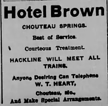 In 1877, a 4-story frame hotel 190 x 45 ft. was built in Chouteau Springs for about $25,000 with C. B. Lakin of Kansas City as the architect. It had a passenger elevator, steam bath, speaking tubes, hardwood, stained glass.[10] In 1906, there was a hotel in Chouteau Springs called the "Hotel Brown".