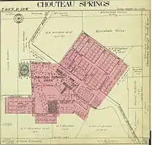 Chouteau Springs was officially platted in 1886 beside a mineral spring, and named after Jean Pierre Chouteau, the original owner of the town site.[13]