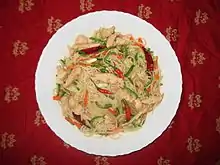 In Panama, chow mein is prepared with a mixture of onions, peppers, celery and carrots with pork or chicken and stir fried with noodles.[53][54] Another recipe includes canned corn.[55] In El Salvador, chow mein may contain carrots, cabbage, and/or broccoli.[56][57]