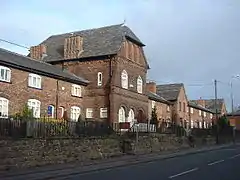 The cotton mills grew out of a cottage spinning and weaving industry that was widespread across the district. As industrialisation gathered pace, local weavers felt threatened by the advent of powered looms, and in April 1812 a mob smashed the machines and burnt down a new factory, Westhoughton Mill, in neighbouring Westhoughton. For this, the Luddites, three men and a boy of 14, were tried at Lancaster Assizes and hanged.[37] Fustian was woven and after 1827 silk[2] also was brought from Manchester.[38] In 1938 James Burton had built cotton mills on both sides of the Hindsford Brook including Lodge Mill. Dan Lane Spinning and Doubling Mills were built in the 1840s and lasted until the 1950s. Howe Bridge Spinning Mills, the largest complex in Atherton was started in 1868 and the last mill built in 1919. It closed as a textile factory in early 1999.[39] Mills built in the 20th century were Laburnum Mills in 1905 (closed 1980), and Ena Mill in 1908 which closed in 1999. The Ena Mill, now converted for other uses, is a Grade II listed building.[40][41]