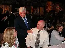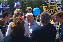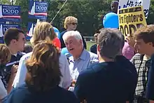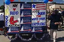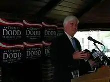 In February, Dodd turned his attention fully to the early primary states of Iowa and New Hampshire.[14] When asked by the Associated Press on the campaign trail if his campaigning really made a difference in changing public perceptions, he replied, "There is enough time yet to change this [public perceptions], because there are places like Iowa and New Hampshire that give candidates like myself a chance to be heard." Dodd's strategy was to speak to voters in restaurants, homes, and small-town diners, although political analysts wondered whether such methods were out-of-date. But he maintained that "chatting in a living room face to face is still a very important feature of campaigning here. I don't think you can come in here and do sort of a wholesale political operation from 35,000 feet (11,000 m) with a pit stop here and there and a media campaign behind you."[15] At the end of February, Dodd differentiated himself from his Democratic counterparts by stating his support for the Bush administration's willingness to hold joint talks with Iran and Syria and by stating that as president he would avoid talking with Iran as long as Mahmoud Ahmadinejad remained as president. On the trail, he referred to Ahmadinejad as a "thug".[16]
