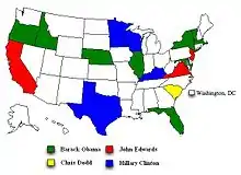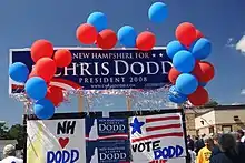 The 2008 presidential campaign of Chris Dodd was launched on January 11, 2007, and ended on January 3, 2008, after a sixth-place finish in the Iowa caucuses.[1] Dodd, the senior senator from Connecticut, sought the nomination of the Democratic Party for president of the United States. Centering his campaign in the states of Iowa and New Hampshire, he centred his campaign on the theme of change. Dodd's performance in the opinion polls varied, but in the financial sphere, he had secured some notable and influential endorsements who were the ones largely funding his campaign.