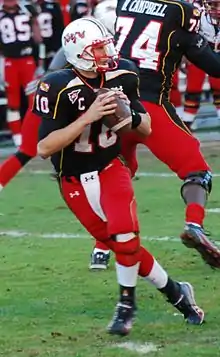 In 2008, Maryland hired a new offensive coordinator, James Franklin, who installed a West Coast offense.[17] That season started with some controversy when head coach Ralph Friedgen initially selected senior Jordan Steffy as the starting quarterback. Turner considered returning home with a transfer to a Californian school, but ultimately decided against it.[18][19] When Steffy was injured again in the season-opener against Delaware, Turner was awarded the starting job for the rest of the season.[20][21] After Maryland defeated 21st-ranked Wake Forest, 26–0, Turner was voted the ACC Player of the Week and ESPN named him an "On the Mark" quarterback.[22][23] Against 16th-ranked North Carolina, Turner's split-second decision to hold onto the ball for a nine-yard run on fourth down and five put the team within range for the game-winning field goal, 17–15. For that, he was nominated for the week's Pontiac Game Changing Performance.[24] The win improved Maryland's record to 7–3 and reasserted control over their ACC championship destiny, although they lost the next game against Florida State, 37–3, which ended the Terrapins' title hopes. The following week against Boston College, Turner set career highs with 33 completions, 57 attempts, and 360 passing yards, but the effort fell short and Maryland lost, 28–21.[25] In the postseason, the Terrapins played Nevada in the Humanitarian Bowl where Turner threw for 198 yards, one interception, two touchdowns including a 59-yard long, and a two-point conversion.[26] At the end of the season, Maryland had beaten four out of their five Top 25-ranked opponents, a feat that was surpassed only by the teams in the BCS Championship Game: Florida and Oklahoma.[27]