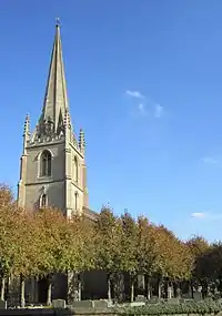 The new parish of Christ Church was created and a new structure was commissioned to be designed by Bath architect G. P. Manners in 1839. Consecrated in 1841, it was "originally...a simple design with plain walls, clear glass windows and stone flagged floors and was in the Perpendicular style." Later Victorian taste in churches was for something more elaborate, so in 1875 it was "restored" by Sir George Gilbert Scott; the east end was rebuilt, with an extra bay beyond the east wall to form a sanctuary. After Scott's death in 1878, interior work was overseen by his son John Oldrid Scott. Further work in 1884 included the addition of a south porch, and in 1919 C.E. Ponting added the south chapel as a war memorial to C. Eric Moulton.[1]