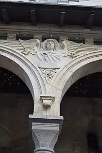 The gable is topped by a kneeling angel created by Thomas Bærentzen. He also designed the angels on the loggia, the two animal figures in the window group and the reliefs at the base of the tower depicting the Four Evangelists' symbols.