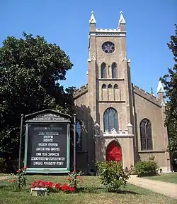 - 1849 A four-story tower, including the narthex with buttresses and a center door, was added. The narthex measured 40' side and 11'6" deep. The gallery steps were moved to the narthex, allowing stoves on each side of the nave where the steps had been. Battlements, folded sheet-iron finials, and wooden tracery in arched windows were added to give an English neo-Gothic appearance. A bell, still in use, was installed in 1850.
